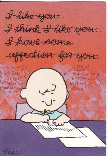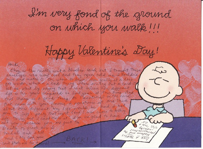 The other great part about that Valentine’s Day was that when we exchanged official Hallmark cards later, we gave each other the exact same one. It was a one-two punch, first the flowers and then that card. I was already pretty far gone, but that sealed the deal, I think. And believe me, he was going to need that sealing. He was soon to make me sticky spaghetti with salsa for sauce and have me over to watch Xanadu. Naw, who am I kidding? That made me love him all the more too.
