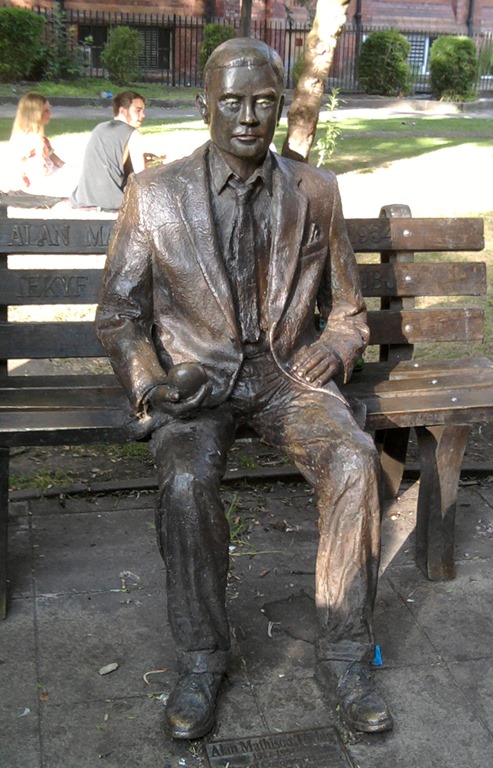 2013-07-14 19.07.21If you’ve been reading other blog posts about the 2013 UK Meet you’ve probably met this guy already, but I couldn’t resist putting in my own pic of the statue of Alan Turing in Sackville Park in the centre of Manchester. I find it unbearably poignant that the statue includes the poisoned apple he used to end his own life – and hugely uplifting that the statue is regularly enhanced with nail polish, flowers, etc by members of the GLBTQ community. When we saw him, he was sporting eyeshadow courtesy of the Sparkle trans* crowd, who had their annual event in the park over the same weekend as UK Meet. Manchester was buzzing – and very glamorous! Open-mouthed smile